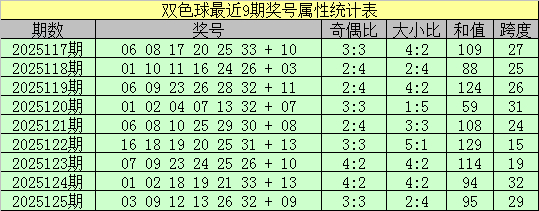 双色球上期第2025125期奖号为03 09 12 13 26 32 + 09,红球号码奇偶比为3:3,大小比为2:4,和值为95,跨度:29。