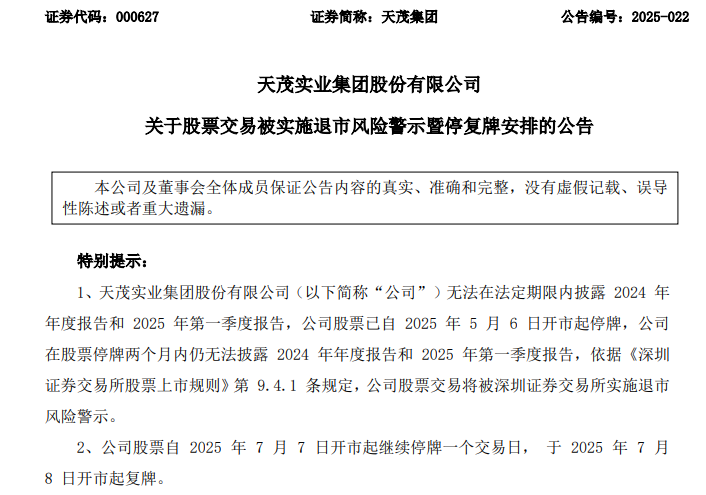 7月6日晚间,天茂集团(000627)发布公告,公司股票7月7日继续停牌一个交易日,7月8日开市起复牌并被实施退市风险警示,股票简称由“天茂集团”变更为“*ST天茂”。